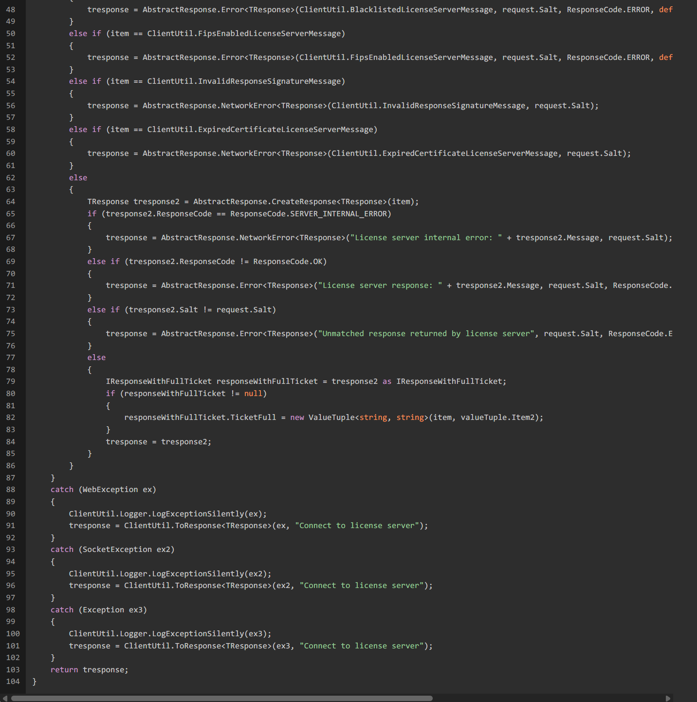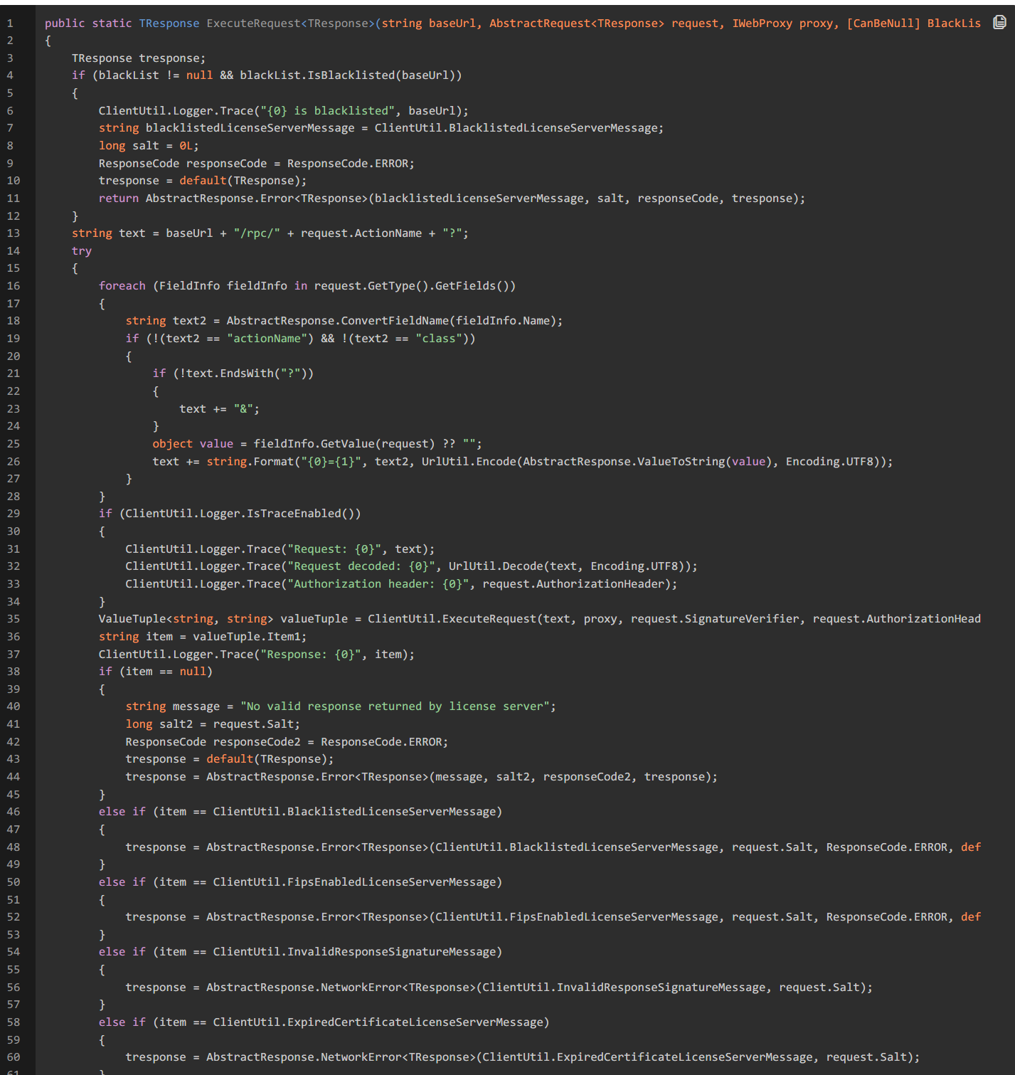 搜索字符串License server response定位到ClientUtil.ExecuteRequest中