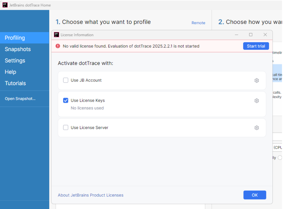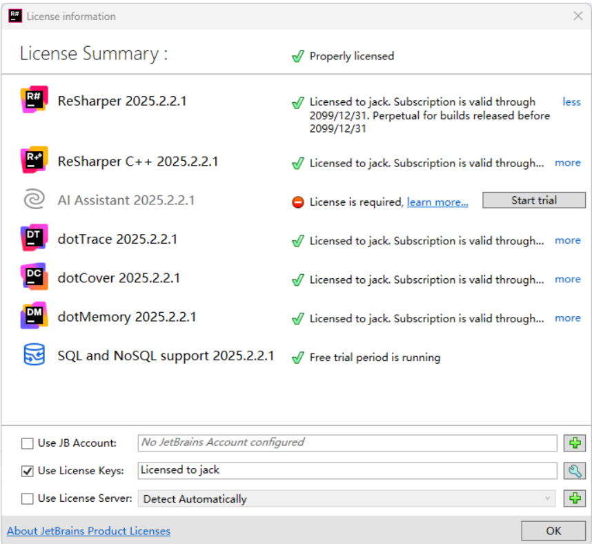 上面只是将 VS 插件解决掉了,独立的dotCover、dotTrace、dotMemory软件依然是未授权的,另外一个dotPeek因为官方将其免费了所以不需要授权。