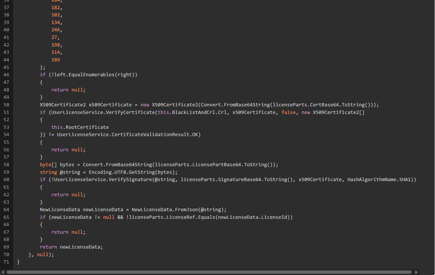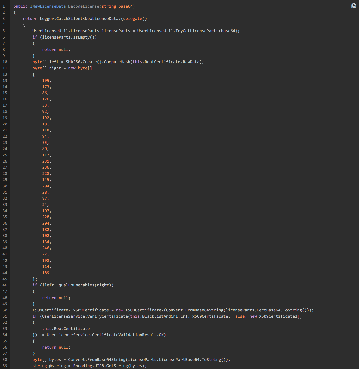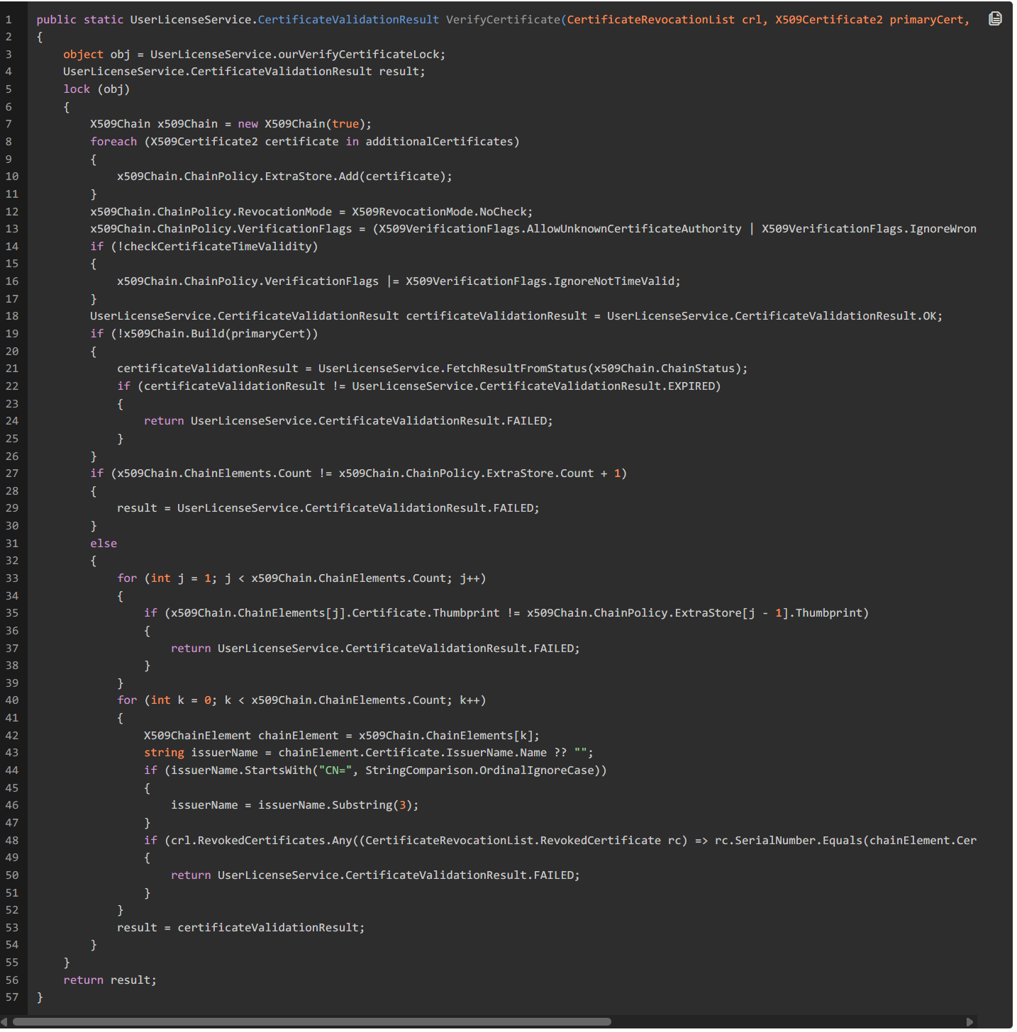 UserLicenseService.VerifyCertificate是个静态方法,用于验证证书。