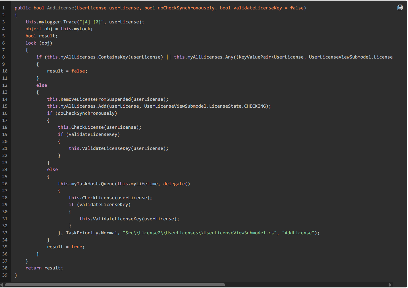 分析调用栈,发现在UserLicenseViewSubmodel.AddLicense方法中存在调用UserLicenseViewSubmodel.ValidateLicenseKey的行为: